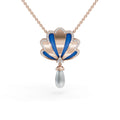Introducing the Ocean Fanfare Pendant, an elegant piece of lifestyle jewelry inspired by the sea. This pendant features a stylized seashell design, crafted in rose gold with deep blue enamel accents that mimic the rich hues of ocean depths. At the center, a pear-shaped pearl dangles gracefully, reminiscent of a precious ocean droplet, adding a sophisticated and natural elegance.