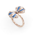 Inspired by the beauty of the ocean, the Ocean Clover Ring is a stunning blend of elegance and playfulness. Crafted in rose gold, this exquisite ring features a delicate bow design, symbolizing love, luck, and timeless charm. The graceful loops are adorned with soft blue enamel, evoking the serene hues of coastal waters, while brilliant lab-grown diamonds add a shimmering touch of sophistication.